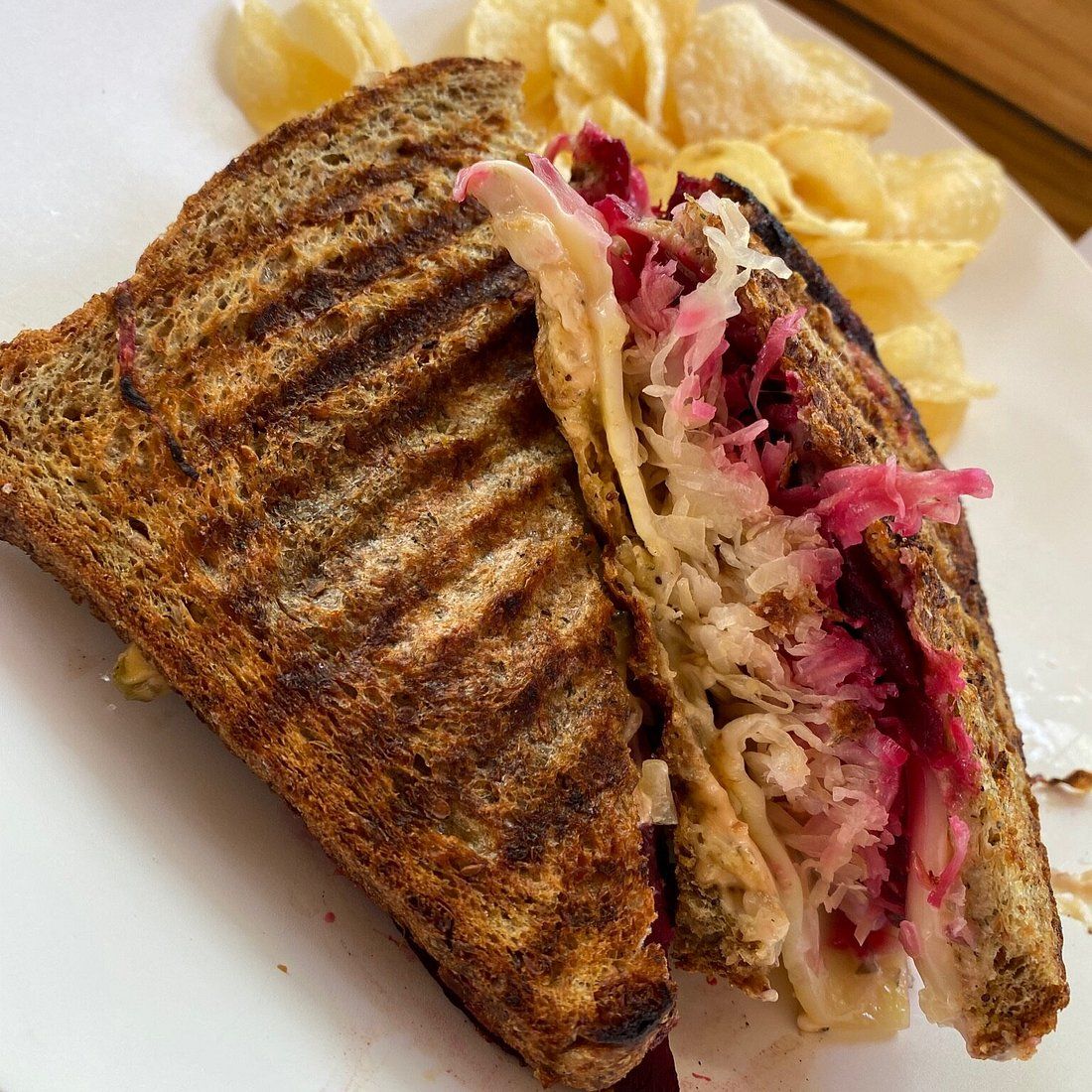 Capers, red and green onion, celery, lemon juice, avocado, melted sharp white cheddar on multigrain toast.